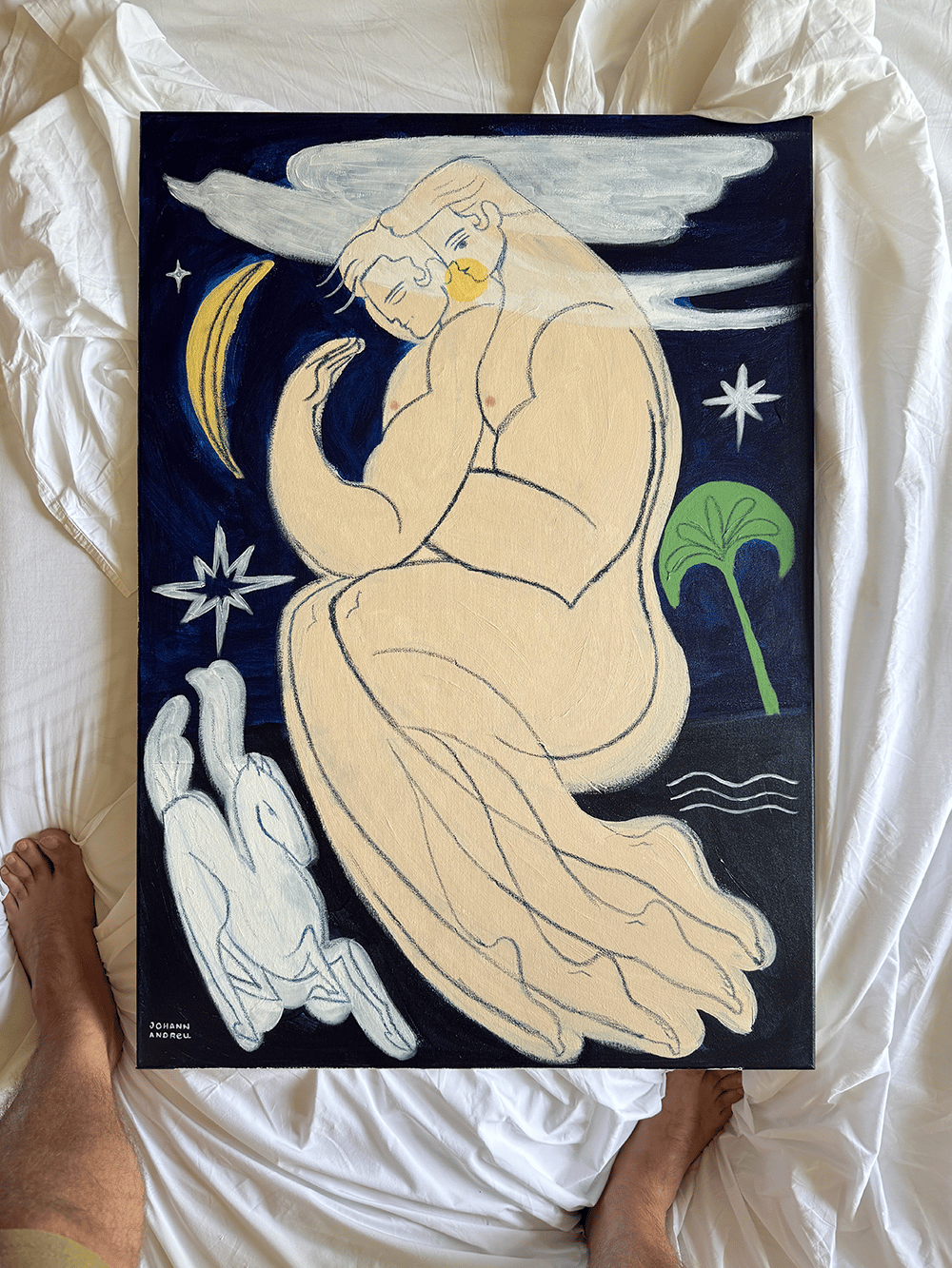 Two male figures intertwined in the summer night. One of them whispers something into the other's ear—words we do not know, yet for the listener, they are as beautiful as the elements depicted throughout the painting: the moon shining in the sky, the stars, a nimble horse perhaps emerging from a dream, the coral-like unfolding of palm leaves, and ever-present, the sea and its waves.